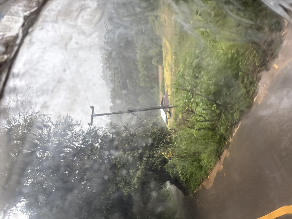 An external view from inside a vehicle on a wet, curving asphalt road in Ban Paem Bok, Thailand, under overcast conditions. Rain droplets are visible on the transparent surface through which the image was captured. A dark gray road with a partial yellow double solid line curves sharply to the left in the lower-left quadrant. Dense green foliage and tall grasses line the right side of the road. Further into the midground, large green trees flank the road on the left. A wooden utility pole with attached wires stands vertically on the right side of the frame, positioned amidst the vegetation. Behind the pole and vegetation, a small, open-sided shelter with a dark, possibly thatched roof and lighter support posts is visible. Adjacent to this structure is a field of yellow-golden crops, indicative of agricultural land. The background features hills covered in dense green forests under a light gray, hazy sky. No individuals are present.