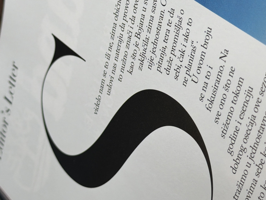 This image displays a close-up, angled view of a printed page, reportedly from Bar, Montenegro. The primary subject is a large, decorative black capital "S" functioning as a drop cap, positioned on the left side of the white page. Black text, set in a serif typeface, is printed to the right and below the "S". A partial heading, "Editor's Letter," is visible along the top edge of the frame. The language of the text is a South Slavic language, indicated by characters such as "č" and "š". The page exhibits a slight concave curvature, consistent with an open book or magazine. A subtle blue tint is visible at the lower right edge of the page. No individuals or specific actions are depicted. The scene is evenly illuminated.