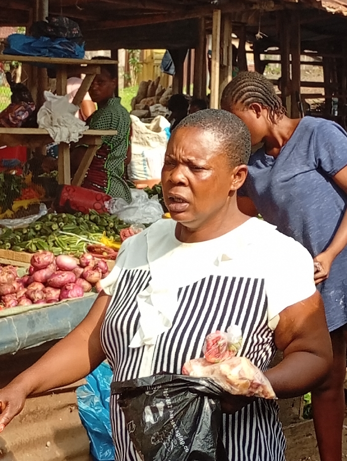 The scene depicts a bustling outdoor market in an unspecified city. In the foreground, a dark-skinned woman with short, dark hair wears a white short-sleeved top with a black and white striped torso. Her mouth is slightly open, and she holds a black plastic bag containing smaller clear plastic bags of packaged items in her left hand. To her left, on a market stall, are piles of red onions and green okra pods. In the mid-ground, a dark-skinned woman with braided hair, wearing a blue t-shirt, is partially visible from the back, leaning forward. In the background, to the left, a third dark-skinned individual wearing a green patterned top is seated behind a wooden stall. The environment features rustic market structures with wooden frames and corrugated metal roofing, displaying various goods, including large sacks and other produce.