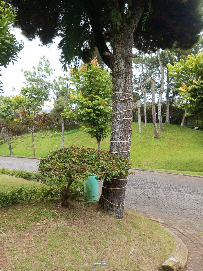 The scene depicts an outdoor landscaped area in Orehat, India, under an overcast sky. A large tree with dark, textured bark dominates the right foreground, its trunk spirally wrapped with a light-colored rope from its base upwards. To the left of this tree, a dense, rounded shrub with green and reddish foliage is positioned, with a teal-colored cylindrical object partially visible behind it. A silver-colored metal spigot extends from the ground in the lower center. A paved pathway, constructed from interlocking grey pavers, curves along the right side of the frame, bordered by a concrete curb separating it from a grassy slope. In the midground and background, additional trees with varied green foliage and slender trunks are scattered across undulating grassy hills. No individuals are present.