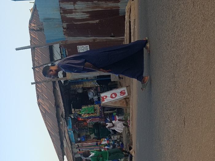 An outdoor street scene in Jos, Nigeria, features an adult male walking from right to left across a grey asphalt road in the foreground. He wears a dark blue, loose-fitting traditional garment and striped slides. In the background, a row of informal commercial structures with rusty corrugated metal roofs and walls displays various goods, including clothing and household items. A young male child in a green uniform stands near a storefront on the left. Closer to the center, a young female child in a white and pink patterned dress sits on a raised platform. A white A-frame sign with vertical red "POS" lettering is positioned on the unpaved area between the road and the shops. The sky overhead is clear and light blue.