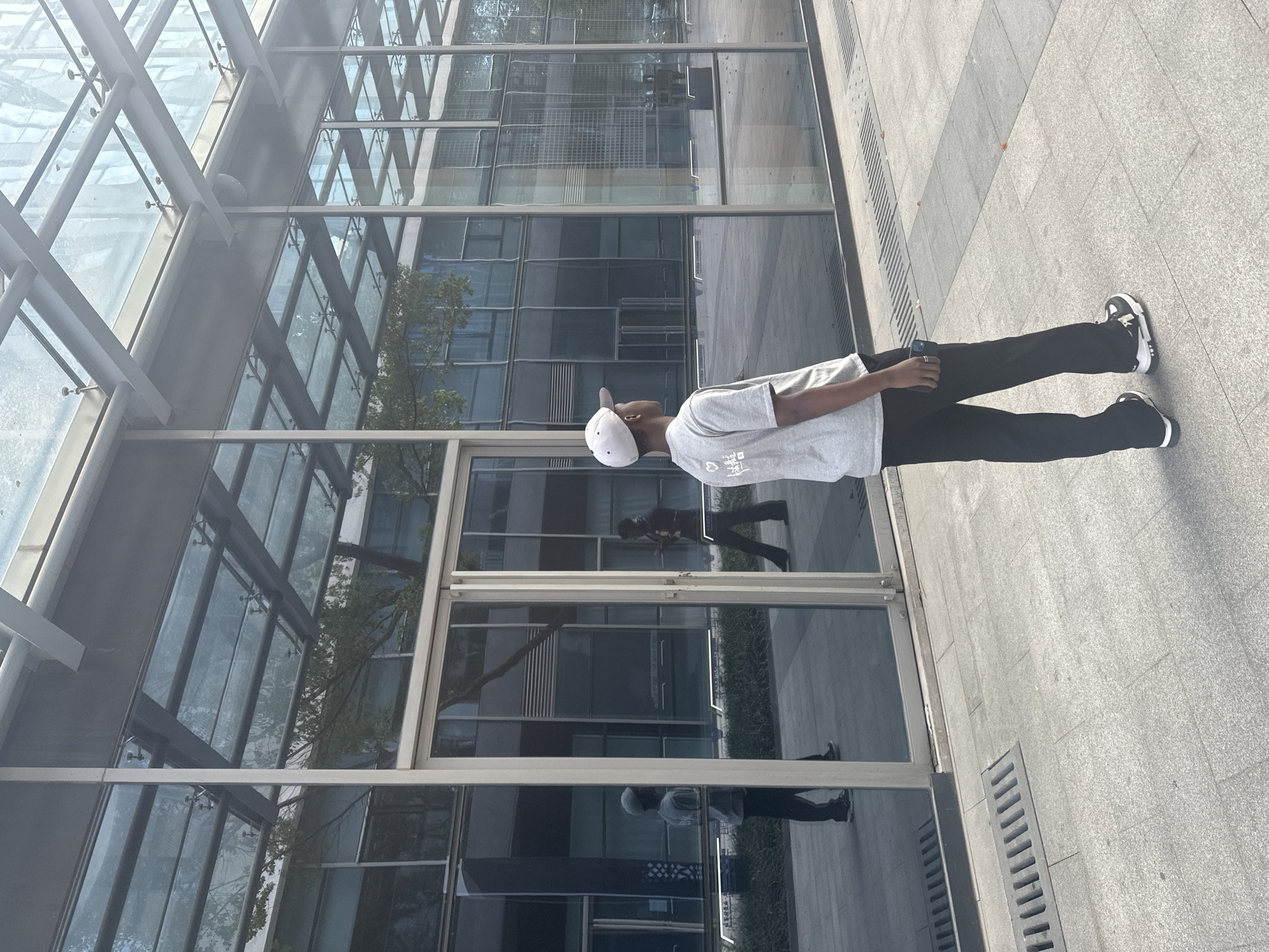 The image depicts an outdoor urban scene in Jiangning District, China, in front of a modern building with a dominant glass facade and a glass canopy. The ground is paved with light grey rectangular tiles, featuring linear storm drains. A male subject, viewed from behind and slightly to the right, is walking away from the camera towards the right side of the frame. He is wearing a white baseball cap turned backward, a grey short-sleeved t-shirt with a white graphic design on the back (including what appears to be a heart symbol and stylized text), dark trousers, and black and white athletic shoes with prominent soles. He holds a dark-colored smartphone in his left hand at hip level. The building's glass facade acts as a highly reflective surface. In the left set of double glass doors, a reflection of a person resembling the main subject, also wearing a light cap and top, is visible, appearing to stand or walk. In the right set of double glass doors, a reflection of a second male individual is seen walking from left to right, wearing dark clothing and holding a smartphone in his right hand. The reflections also show trees, parts of the sky, and abstract patterns of the building's interior or distant structures. Above the ground, across the lower sections of the glass doors, faint white horizontal lines and indistinct characters are reflected.