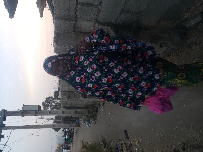 A person wearing a floral-patterned headscarf and gown stands in a street next to a rough stone wall. They hold a pink plastic bag. A utility pole and lines are visible in the background, along with market stalls and hazy sky. The street is littered with debris. The overall scene appears to be in a low-income or rural area. The photo is taken during daylight hours.