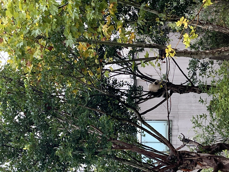 A giant panda is positioned within the mid-ground, perched among the branches of a tree at the Chengdu Research Base of Giant Panda Breeding in Chengdu, China