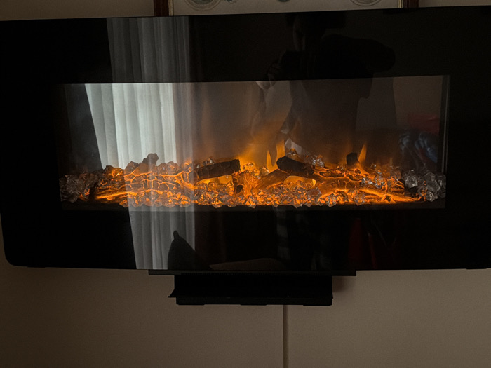 A rectangular, wall-mounted electric fireplace features a black frame. The interior shows simulated flames and embers amongst faux crystals and logs. The reflection of a person and a window curtain are visible on the glass front. Below the fireplace is a black mounting bracket, with a white power cord extending downward. The wall behind the fireplace appears to be light-colored.