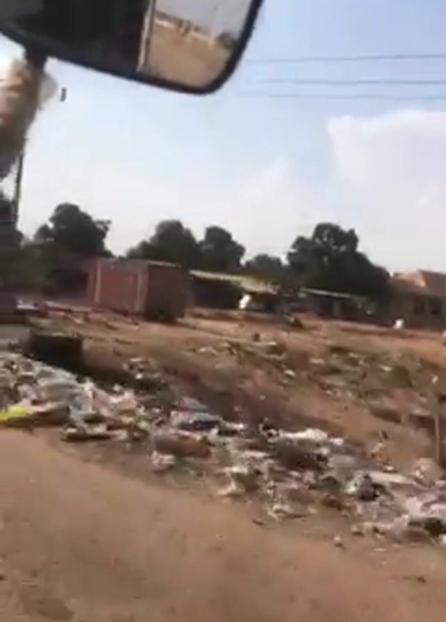 The video appears to be shot from the inside of a moving vehicle, possibly a car or truck, with the camera pointed towards the right side. The view through the window and side mirror shows a rural or underdeveloped area. The road is unpaved, appearing as a dirt or gravel road. The surrounding landscape consists of dry vegetation, scattered trees, and rudimentary structures. Litter and debris are visible along the roadside. The buildings seem to be small shops or residences, with simple constructions. One structure appears to be constructed of metal shipping containers. Power lines stretch across the sky. A woman in a dark dress and head covering walks along the side of the road, carrying a yellow bag. There are yellow jerrycans near a roadside stand.