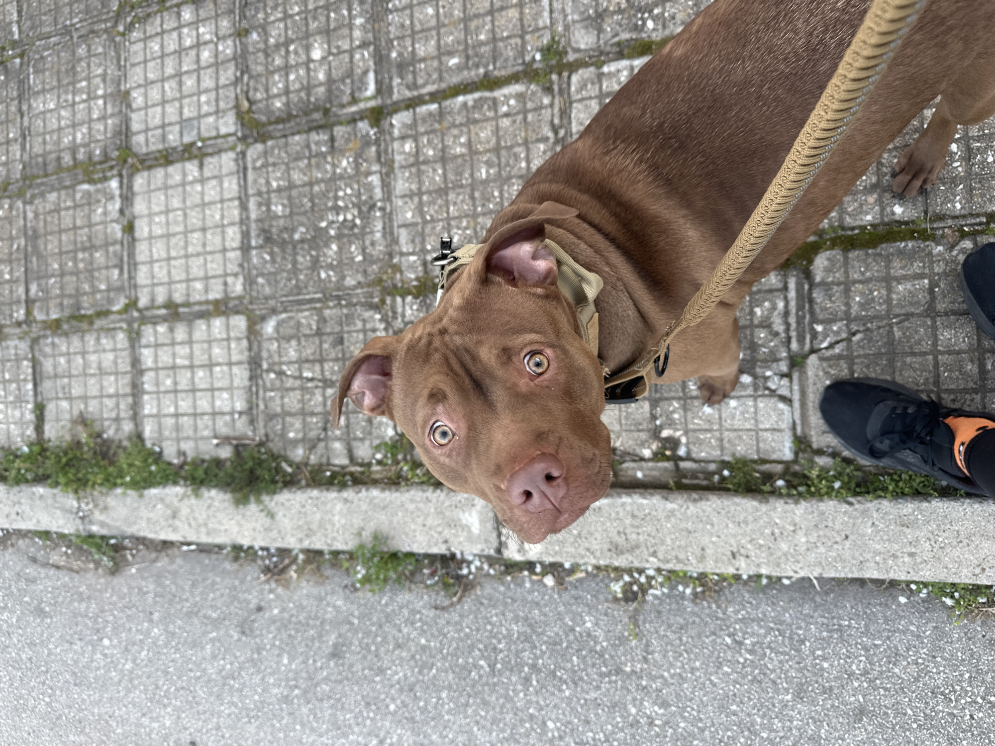 The image depicts an overhead view of a brown Pit Bull type dog on a leash, positioned on a sidewalk in Malevo, Bulgaria. The dog, with reddish-brown fur, is wearing a tan collar with a metallic buckle and a matching braided tan leash extending downwards out of frame. Its head is tilted slightly upwards, with wide, attentive eyes exhibiting prominent amber irises and dark pupils. Its nose is pinkish-brown. The dog's body extends towards the lower right. A person's left foot, wearing a black athletic shoe with an orange ankle sock, is visible in the lower left foreground, standing on the sidewalk and presumably holding the leash. The environment consists of a grey asphalt road on the left, separated by a concrete curb from a grey concrete sidewalk on the right. The sidewalk is constructed of square tiles with a grid pattern. Small patches of green vegetation are visible in the cracks of the sidewalk and along the curb. Scattered white debris or small blossoms are present on the asphalt near the curb.