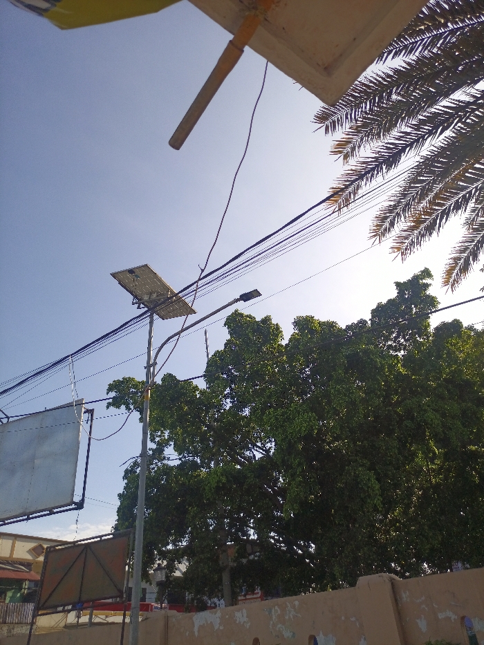 A solar panel and street light share a pole beneath a web of power lines against a bright blue sky. Lush green trees fill the background, partially obscuring a tall, light-colored wall. Palm fronds hang in the upper right corner, while a section of a beige roof appears at the top. Part of a large, framed sign is visible in the lower left.