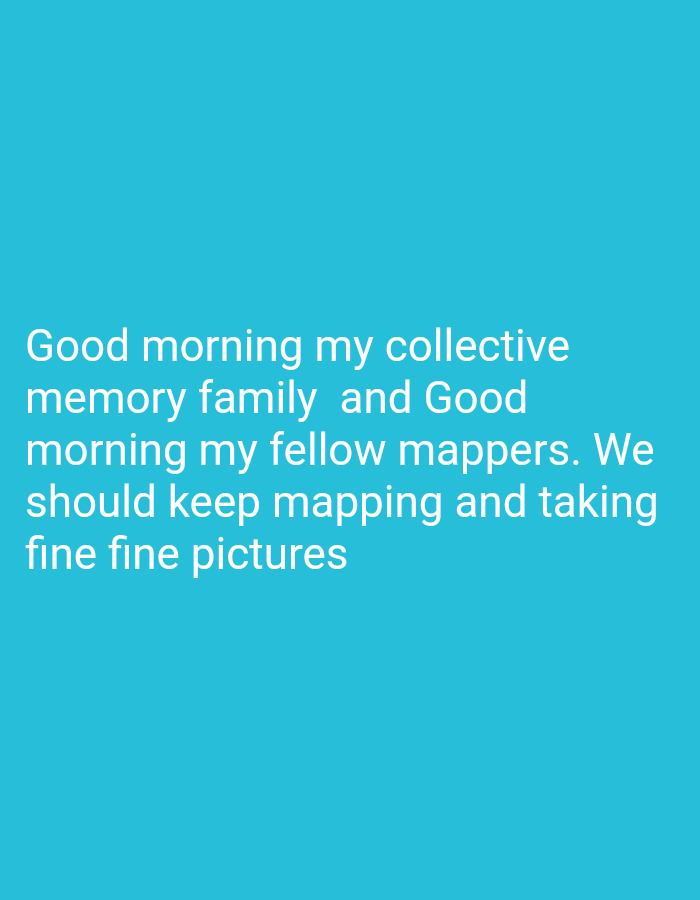 The image displays a digital graphic with a solid blue background. White, sans-serif text is centered towards the lower half of the frame. The text reads: "Good morning my collective memory family and Good morning my fellow mappers. We should keep mapping and taking fine fine pictures." No people, physical subjects, objects, actions, interactions, or specific environmental details are visually depicted within this image. Therefore, no physical location in the city of Hotoro North, Nigeria, or any other geographical area, is discernible from the visual content. The scene is exclusively a textual message on a colored digital canvas.