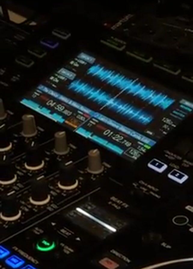 A close-up shot focuses on a DJ's mixer console, showing a detailed waveform display on its screen, alongside numerous knobs and buttons
