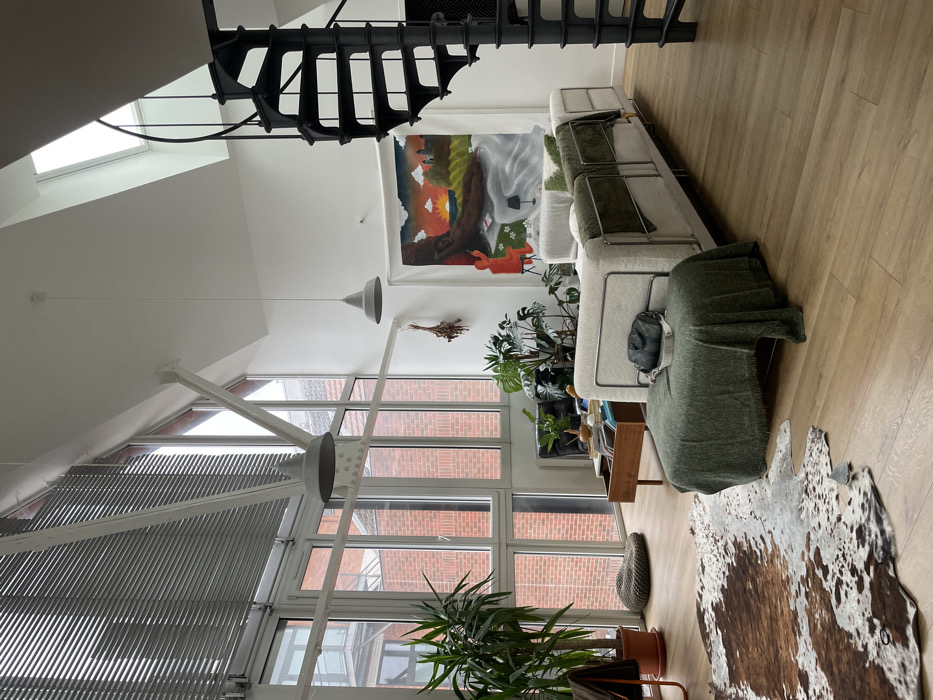 The image depicts the interior of a spacious, well-lit living area within a loft apartment located in Saint-Denis, France