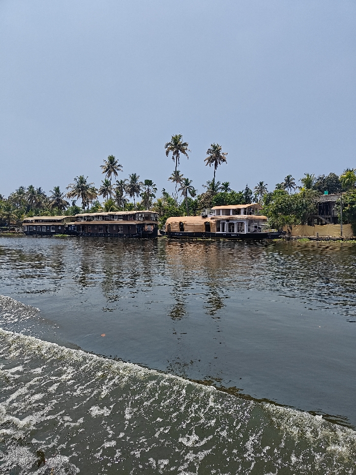 The image captures a daytime scene in Kainakary, India, focusing on a waterway and its adjacent bank. In the immediate foreground, a distinct white, frothy wake is visible on the dark water, indicating movement by the vantage point of the photograph. A small, reddish-brown object floats on the water near the wake. Along the distant bank, three houseboats are either moored or docked. The leftmost houseboat is long and dark, featuring multiple windows and rooftop structures. To its right, a two-story houseboat with a lighter, possibly wooden or bamboo-clad hull, displays a curved roofline and white architectural elements, including columns or railings on its upper deck; the alphanumeric "HTZ 109" is visible on its side. A third, darker houseboat is partially visible behind the lighter vessel on the right. The land beyond the houseboats is densely vegetated with numerous tall palm trees and various other green foliage. On the far right, a section of a building with unfinished concrete walls and a light-colored fence is partially visible amidst the greenery. The upper third of the image shows a clear, light blue sky. No human figures are present.