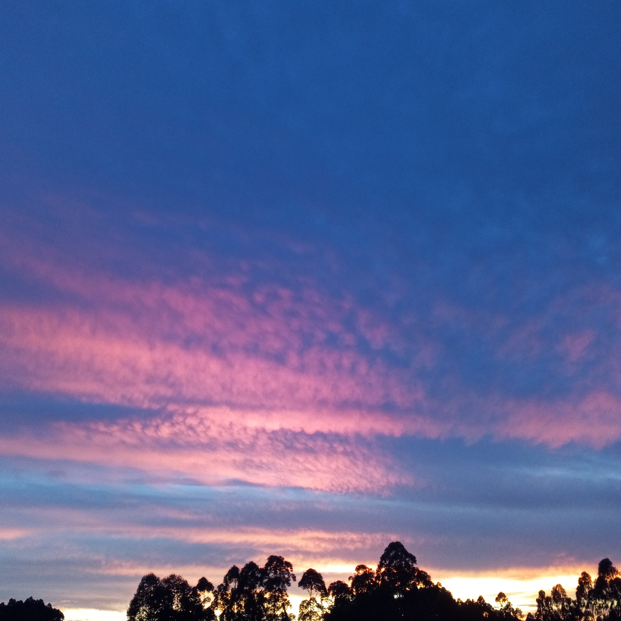The image depicts a sunset over Borabu Chitago ward, Kenya. In the foreground, silhouetted trees stand against a vibrant sky. The sky transitions from deep blue at the top to shades of pink, purple, and orange closer to the horizon. Wispy clouds are visible in the colorful portions of the sky. No people or interactions are visible in the image. The environment is a natural setting during twilight hours.