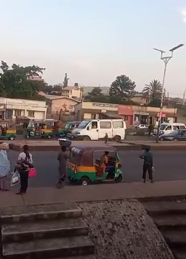 busy street scene in a town or city, likely in Africa or a similar region. There is a two-lane road with traffic including cars, vans, and many auto-rickshaws (tuk-tuks). People are standing and walking on the sidewalk beside the road, and some appear to be waiting for transportation. Some are in traditional clothing, like headscarves. There is a bicycle parked near a tuk-tuk. Buildings line the street on the other side of the road. The overall impression is of a bustling, typical urban scene in a developing country. The camera position is slightly elevated, looking down on the scene.