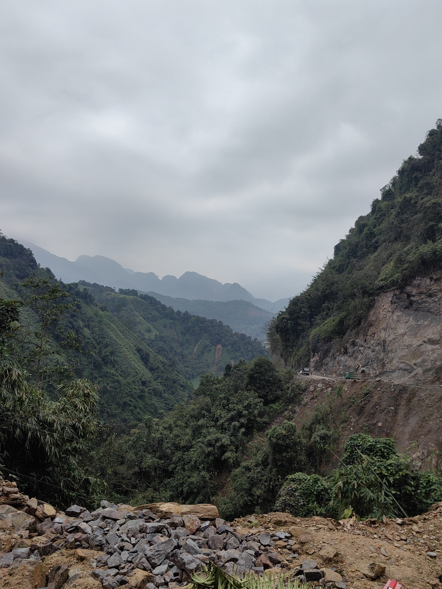 The image depicts a mountainous landscape in Thuận Hòa Commune, Vietnam, under an overcast sky. In the foreground is a pile of rocks and dirt. Beyond this, a valley is visible, filled with lush green vegetation. A road cuts along the mountainside on the right side of the frame. A truck, construction equipment, and a cyclist can be seen on the road. The distant mountains are shrouded in a misty haze.