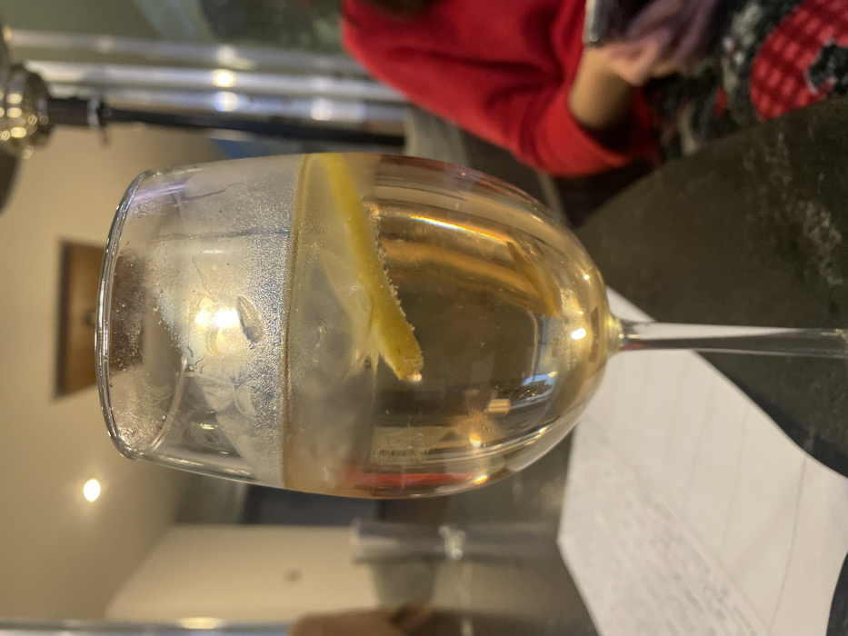 A partially filled wine glass sits on a table, likely indoors. It contains a clear liquid with ice and a lemon wedge. The glass is condensation-covered. Behind the glass, out of focus, a person in a red sweater is present. The background includes a wall with a painting and some kind of hanging appliance. The table surface is a dark, reflective material, likely marble or granite. A piece of paper lies beneath the wine glass.