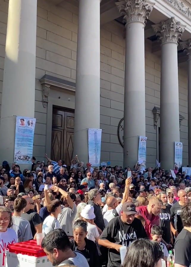 A large crowd of people is gathered in front of a building with large, white columns. There are banners and signs visible in the crowd, many of which are held up high. Some people are taking photos or videos with their phones. The sky is blue and clear. In the background, there are trees and other buildings. A few palm trees stand amongst other green foliage. A stage can be seen being used at the back of the crowd.