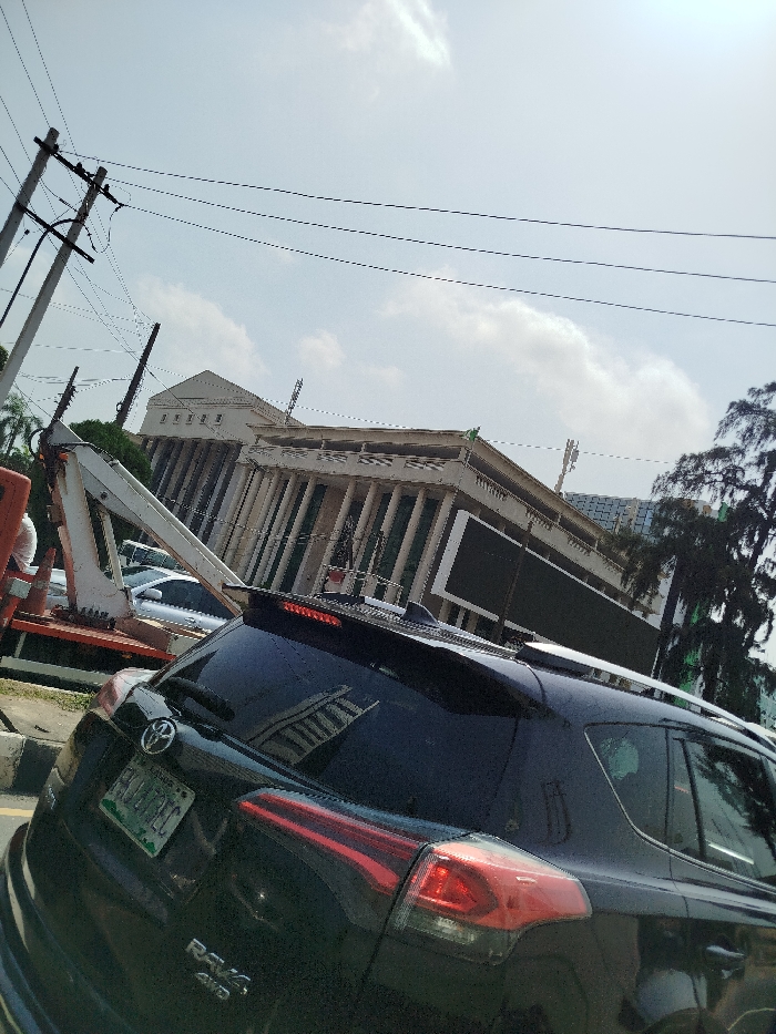 The scene depicts an outdoor urban environment under clear daylight conditions with scattered clouds. In the immediate foreground, the rear of a dark-colored Toyota RAV4 SUV is visible, featuring a license plate that reads "FCT ABUJA F0477EC." Red taillights are present but unilluminated. The vehicle's roof rails are also visible. To the left of the RAV4, a portion of a white and orange-accented tow truck or recovery vehicle is parked, with its boom partially extended. A person in a light-colored shirt is partially visible standing near the tow truck. In the background, a large building with neoclassical architectural design is prominent, characterized by numerous vertical columns supporting a roofline with a pediment. A large, dark rectangular screen is mounted on the building's facade. Utility poles with multiple overhead electrical or communication wires ascend from the left side of the frame. To the far right, dark green trees are present. The perspective suggests the image was captured from another vehicle on a paved road, looking slightly upwards towards the building. A concrete road barrier is visible separating the road lane from the tow truck's position. The location is identified as FCT Abuja, Nigeria, based on the visible vehicle registration plate.