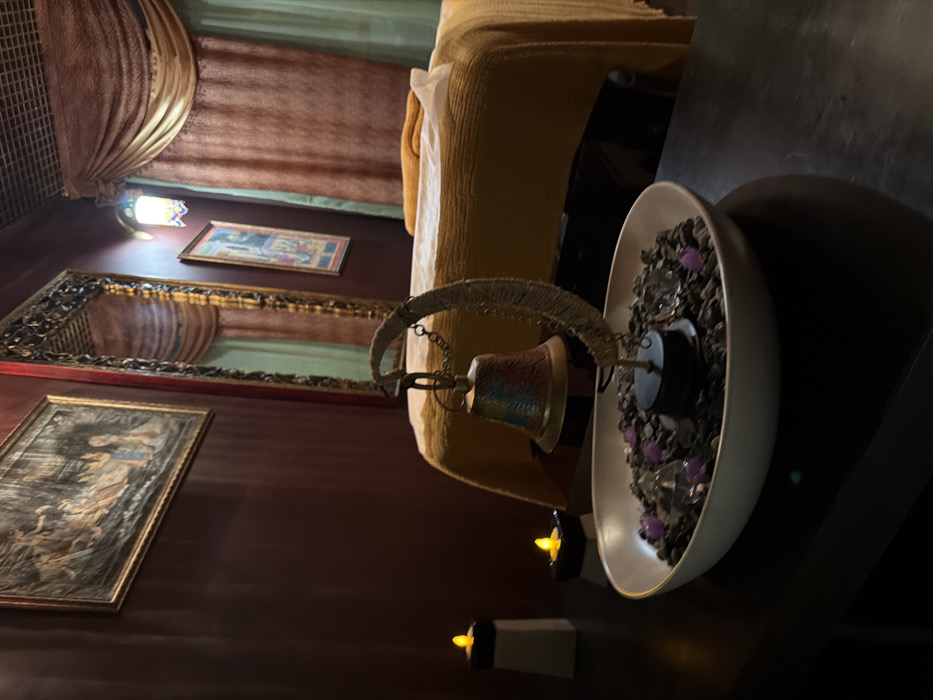 The image depicts an interior space, identified as a room within Surgut, Russia. The environment is dimly lit, suggesting a relaxation or treatment area. In the foreground, a dark, flat surface serves as a table. Upon this table rests a white, oval-shaped ceramic bowl. The bowl contains dark, small pebbles, interspersed with clear, multifaceted decorative stones and several small, purple, flower-like or crystalline objects. Centered within the bowl, a brass-colored bell hangs from a curved, crescent moon-shaped stand, which is wrapped in a light-colored, textured cord or material. To the left of the bowl, two artificial flickering candles are visible: one positioned on a tall, rectangular white stand, and another situated in a small, dark, round dish. In the mid-ground, a massage or treatment table is positioned, covered with a mustard-yellow blanket or large towel. A white sheet is laid over the yellow covering, and a folded yellow towel is placed at the head of the table. The background features dark reddish-brown walls. A large, ornate, gold-framed mirror leans against the back wall, reflecting a section of light green or teal curtain. To the left of the mirror, a horizontal framed artwork, depicting multiple figures, is mounted on the wall. To the right of the mirror, a smaller, vertical framed artwork is visible. Draped curtains are present on the right side of the room, featuring a patterned, reddish-brown or bronze upper layer with decorative trim, and a lighter green or teal underlayer. An ornate, wall-mounted light fixture with a decorative shade is situated above these curtains. A dark, possibly gridded or textured ceiling is partially visible at the top right of the frame. No individuals, direct actions, or interactions are discernible in the scene.