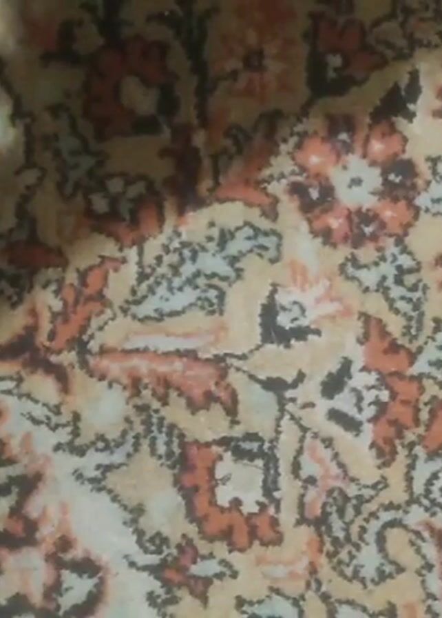 close-up of a rug. The rug has an intricate floral pattern with colors including orange, brown, cream, and black. The rug appears to be old and possibly faded in some areas. The lighting in the video is dim.