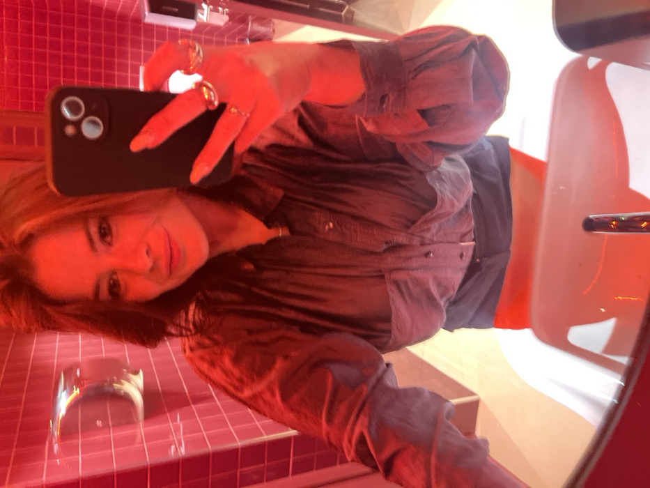 In a red-lit bathroom, a person takes a selfie in a mirror. The person is wearing a gray, button-down shirt with the sleeves rolled up. They have rings on their fingers. A black phone is in their hand, obscuring part of their face. Red tiled walls and a white sink with a metal handle are visible in the background. A chrome hand dryer is mounted on the wall.