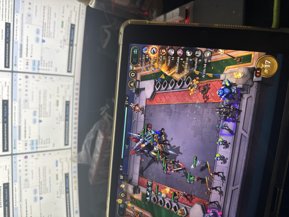 tablet computer displaying a game of Teamfight Tactics, a popular online battle arena game. The tablet is positioned on a table in front of a computer monitor, the screen of which is visible in the background. The game on the tablet is in progress, with 18 seconds on the clock and the player currently at a score of 17. In the game, there are several characters from different teams fighting each other, including a large blue creature, a robot, and a winged character. The tablet is positioned in a room in Vũng Tàu, Vietnam, at the coordinates 10.366 latitude and 107.1 longitude. The room is sparsely furnished and has a dimly lit environment. The tablet is the main subject of the image.