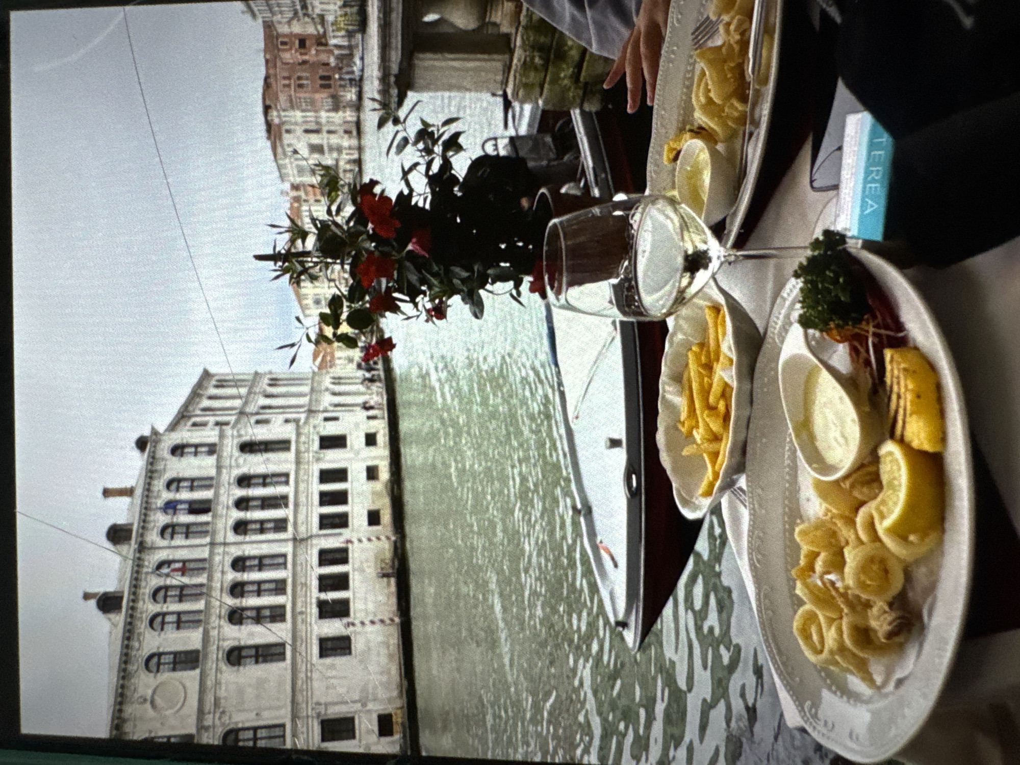The image depicts an outdoor dining scene in the city of Kumanovo, North Macedonia, overlooking a canal. In the foreground, a table covered with a white patterned tablecloth displays two plates of fried calamari, each accompanied by lemon wedges, a piece of grilled polenta, and a small dish of white sauce. A bowl of french fries is also present. A wine glass containing white wine stands prominently, with another glass partially visible. A turquoise-blue pack of "TEREA" brand cigarettes and a dark smartphone rest on the table. Portions of two individuals' hands are visible, one holding a fork over food. In the midground, a potted plant with green foliage and bright red flowers is positioned on the table's edge, next to a stone balustrade. A small, dark-hulled motorboat is partially visible on the canal, situated between the dining area and the opposite bank. The background features a wide canal with rippling, greenish water. On the far bank, a large, ornate white building with multiple stories and numerous arched windows is prominent. Two flags hang from its upper windows: one displaying a red cross on a white field, and another showing vertical blue, white, and red stripes. Further along the canal, additional multi-story buildings with varied cream, ochre, and terracotta facades and tiled roofs line the waterway. The sky above is overcast.