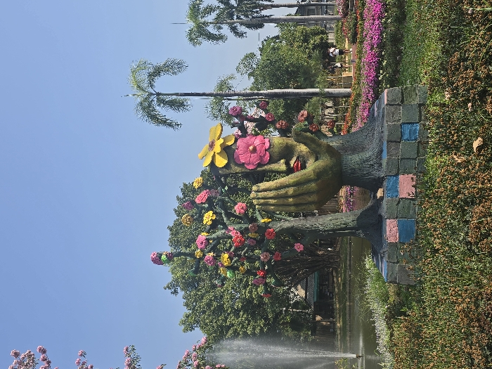 A vibrant, stylized sculpture is centered in the foreground of Nong Buak Hard Public Park, Chiang Mai City Municipality, Thailand. The sculpture features a large, green, human-like face with red lips, partially concealed by two large, yellow-green clasped hands. A prominent pink flower covers the left eye of the face, with a yellow flower on the forehead. Two dark, stylized tree-trunk forms flank the hands, adorned with numerous artificial flowers in pink, yellow, and red. The sculpture rests on a base composed of multicolored square blocks in shades of blue, pink, and grey. The immediate foreground consists of low, sparse, reddish-brown ground cover. To the left of the sculpture, a pond with an active white water fountain spray is visible. A branch from a flowering tree with pink blossoms extends into the frame from the far left. The midground and background reveal a manicured garden filled with rows of purple and pink flowering plants. Two individuals are observed walking along a path within this garden, moving away from the viewer. The background features dense green foliage, including several tall palm trees, set against a clear, light blue sky.