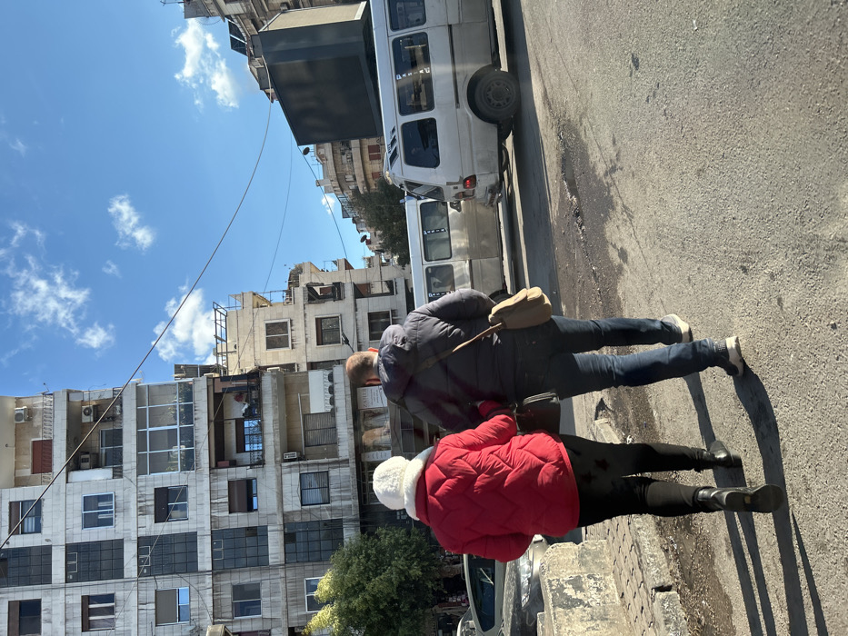 An urban street scene in As-Salihiya Municipality, Syria, captured during daytime under a clear blue sky with scattered white cumulus clouds. In the immediate foreground, two individuals are seen from behind, walking away from the camera on a paved surface adjacent to a street. The individual on the left is wearing a bright red quilted puffer jacket, black pants, and black boots, topped with a white, possibly faux-fur, beanie. They carry a dark handbag on their left shoulder. The individual on the right, appearing male, wears a dark blue puffer jacket, dark blue jeans, and light-colored athletic shoes. He carries a tan messenger bag slung across his body. Their proximity suggests they are together. To their left, a weathered concrete barrier separates the pedestrian area from the street, behind which a dark-colored sedan is partially visible. The asphalt roadway in front of them shows signs of wear, patches, and some wet areas. Two white minibuses are present in the street ahead of the pedestrians; the closest one has faint Arabic text on its side. The minibus further in the background is also white. A large, dark, rectangular structure, possibly an outdoor screen, is mounted atop the rearmost white minibus. Dominating the left side of the image is a multi-story building constructed of light-colored material, featuring numerous square windows, some with external shutters, and several balconies, some enclosed. Air conditioning units are visible on its exterior. In the background, other multi-story buildings of varying designs are visible, consistent with an urban environment. Overhead utility lines traverse the upper portion of the frame. A tree with green foliage is partially visible on the far left between the buildings and the foreground barrier.