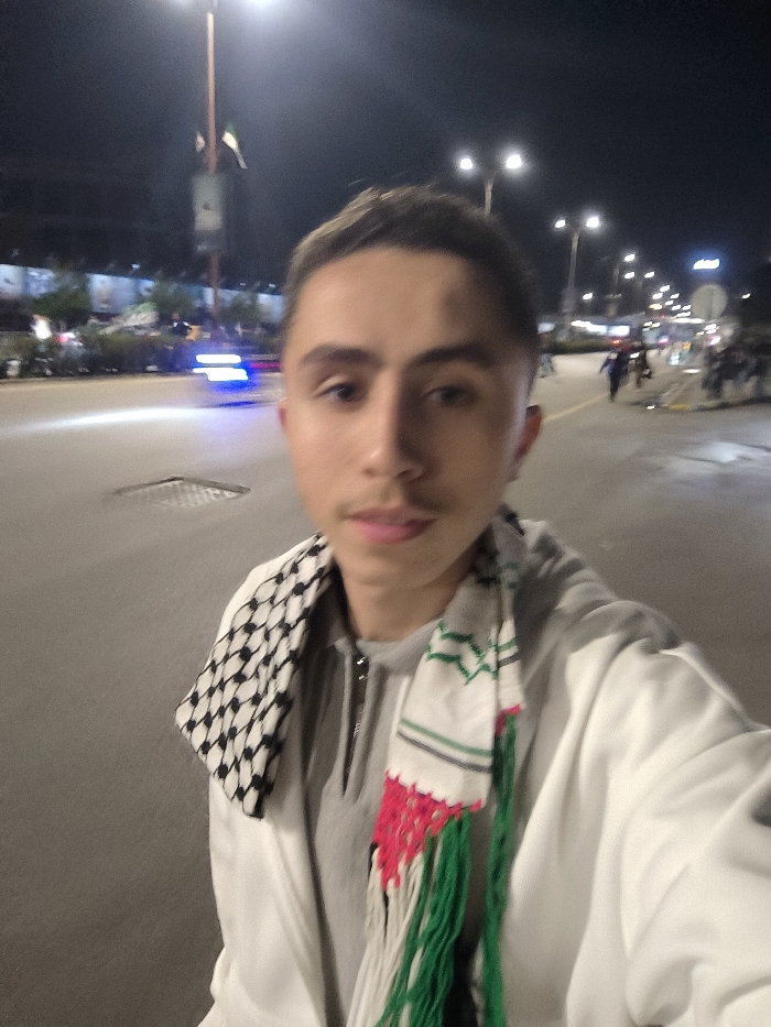 A young man stands on a city street at night, illuminated by streetlights. He wears a kaffiyeh and a white jacket over a gray hoodie. In the background, a blurry police car drives down the street, and people walk in the distance. A street sign is visible in the background. The overall scene suggests a public gathering or event at night.