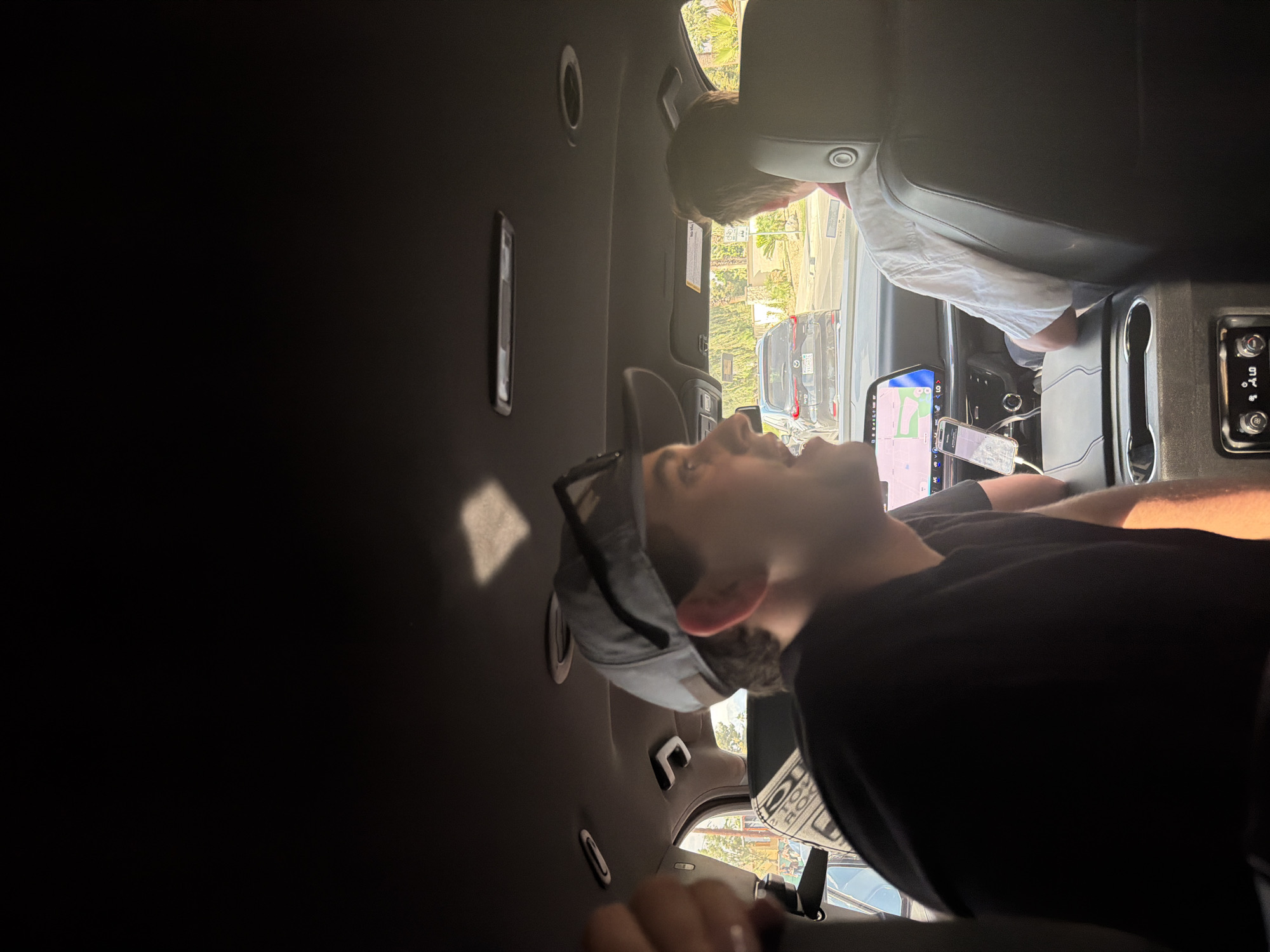 interior of a car, occupied by two individuals. One person, wearing a black shirt and a baseball cap, is positioned in the foreground, possibly in the backseat, looking upward. A second person, wearing a white shirt, is in the driver's seat. The dashboard features a digital display showing a map, as well as a phone and other electronic accessories. The car is parked on a street in a residential area with visible buildings and foliage outside the windows, potentially in Indio, California.