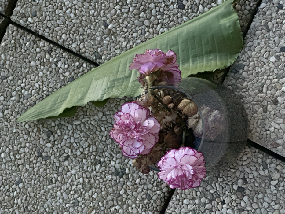 - "A clear, rounded glass planter, containing three pink and white carnation-type flowers and dried botanical material, rests on a pebbled outdoor paving surface in Paris, France" by FM-PvR643, licensed under CC BY 4.0