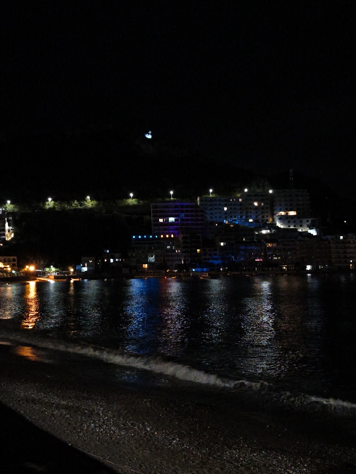 Night view of a coastline with buildings on a hill. Lights from the buildings are reflected in the water. Waves gently wash onto the dark sand. A light shines atop the hill above the buildings, resembling a cross. The scene is very dark, with only the building lights and the water's reflections providing illumination.