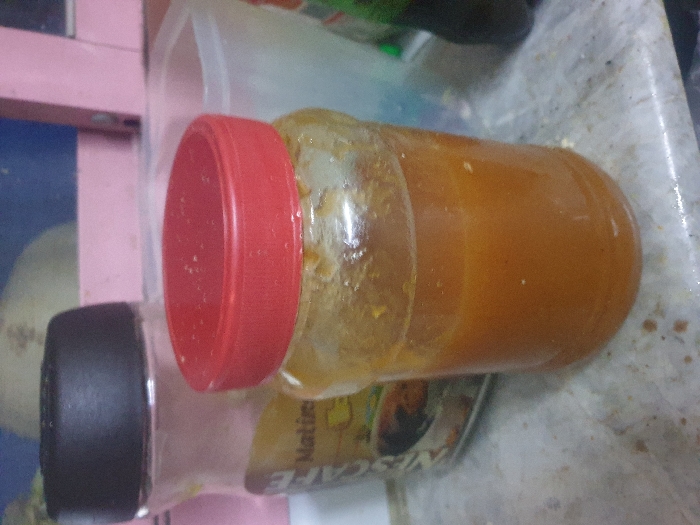 A slightly tilted image presents two plastic jars, one containing a translucent orange substance with a red lid, and another, partly obscured, bearing a black lid and the word "NESCAFE