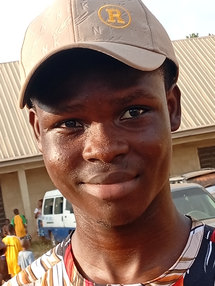 A young, dark-skinned man is prominently featured wearing a light brown cap with a yellow "R" emblem. The scene is outdoors, with a building and parked vehicles visible in the background, along with several people. The man has a slight smile and appears to be the main focus of the image.