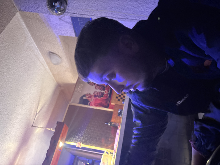 This image depicts an indoor scene within the city of Grohotno, Bulgaria. The primary subject is a male individual, seen in profile, positioned on the right side of the frame and looking towards the left. He has short, dark hair with faded sides, and light stubble on his face. He is wearing a dark, long-sleeved top with the brand "ellesse" logo visible in white text on the left chest area. His mouth is slightly open, and his left arm is extended forward and partially out of frame. Blue and purple ambient lighting illuminates his right cheek and jawline, casting shadows on his features. The background features a textured, light-colored ceiling from which a chain hangs on the left. A wooden structure, consistent with a bar counter, is visible on the left, displaying a yellow object (possibly a mug) and a dark bottle. Behind the individual, a poster or calendar is affixed to the wall, partially visible, with the year "2019" printed on it and an image of people holding drinks. A checkered pattern is present on the wall to the left of the subject's head. On the right, a wall-mounted light fixture and a small, reflective disco ball ornament are visible. A blue illuminated sign is also present on the far right wall. The environment suggests a casual establishment, possibly a bar or cafe.