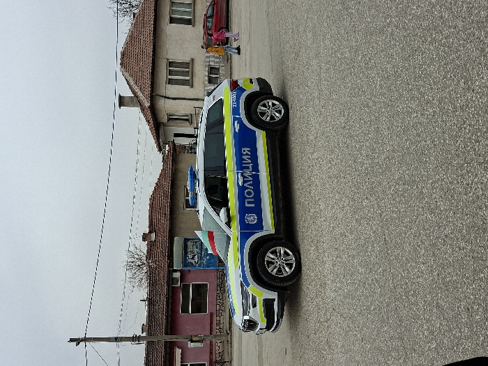 The image displays a street scene in Ihtiman, Bulgaria, under an overcast sky. A white Skoda Kodiaq SUV, marked as a Bulgarian police vehicle, occupies the central foreground, oriented towards the left. The vehicle features blue and yellow reflective stripes along its sides, the word "ПОЛИЦИЯ" (POLITSIYA) in Cyrillic in blue font, and a blue light bar mounted on its roof. A small Bulgarian flag is affixed to the front fender on the vehicle's right side. A numerical identifier "22491/2" is visible on the rear passenger door. The road surface in the foreground is grey asphalt. In the mid-ground, on the right side of the frame, two individuals are walking away from the camera: an adult wearing a yellow coat and a child in a pink coat. They are positioned near the edge of what appears to be a paved or unpaved area adjacent to the road. The background features several buildings with reddish-brown tiled roofs. On the left, a single-story structure with a pink facade, an awning, and an external air conditioning unit is visible. To its right, a two-story light-colored building with multiple windows and a prominent chimney is present. A red car is partially visible, parked near this light-colored building, behind the two individuals. A utility pole with overhead wires is visible on the far left. Bare tree branches are discernible above the buildings.
