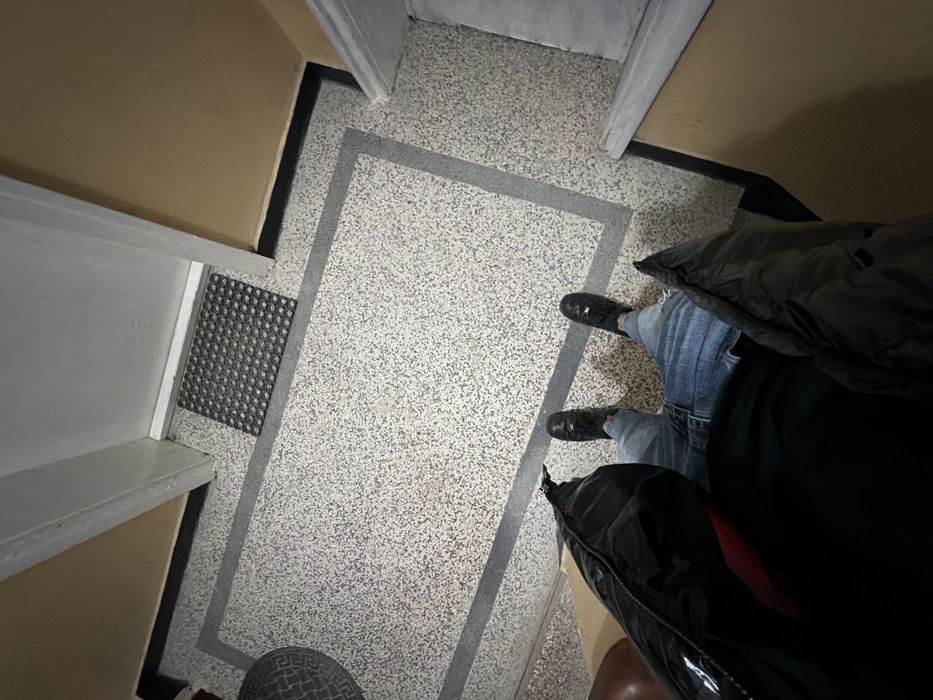 The scene, set in Rudozem, Bulgaria, is viewed from a downward, first-person perspective. The lower body of an individual is visible, wearing light blue distressed jeans and black lace-up shoes. A dark, possibly black, puffy jacket covers the upper legs and lower torso, revealing a red undergarment on the left side. The floor is light grey speckled terrazzo, featuring an inner and outer dark grey rectangular border. A white doorframe occupies the top center, with a black, perforated rubber doormat placed at its threshold. The adjacent walls are tan, underscored by a black baseboard. A circular, patterned floor element is partially visible on the far left.