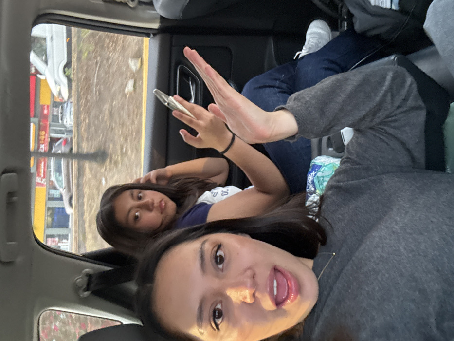 Two young women are in a car. One girl lying down, looking at the camera while using a phone, and another one is taking a selfie with an open mouth and tongue out. They are wearing casual clothes, the selfie taker has on a grey top and the other has on a blue and white shirt with jeans. The background shows buildings passing by outside the car window.
