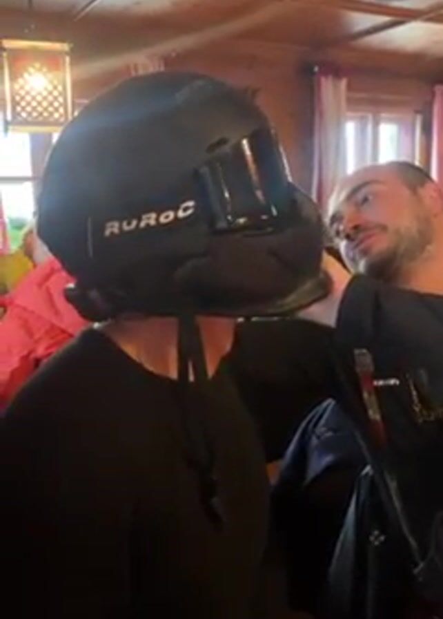A man is adjusting a black Ruroc ski helmet on another person's head. The person wearing the helmet is facing away from the camera, dressed in a black long-sleeved shirt. The man adjusting the helmet is standing behind them, wearing a dark jacket. They are in a room with a wooden ceiling and hanging light fixtures. In the background, people are seated at tables. There are windows behind the tables. The general atmosphere appears to be casual and indoors.