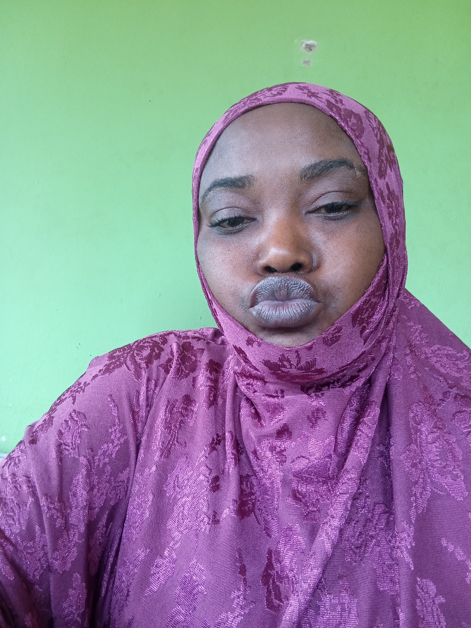 A person wearing a purple hijab poses against a light green wall. The hijab has a floral design. The person is looking directly at the camera with pursed lips. The background is plain. This is not possible to place this photo in the Muhammadu Dikko Stadium, Nigeria.