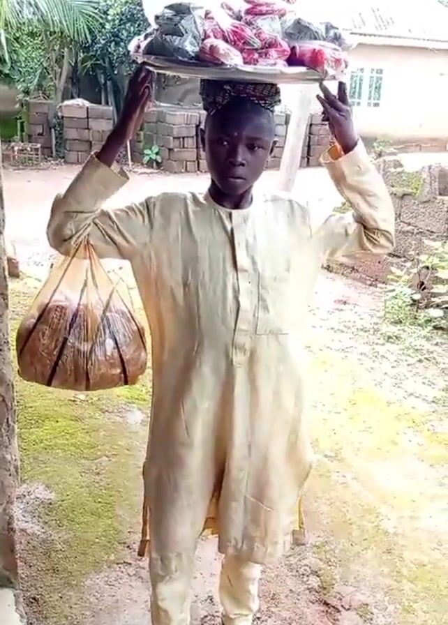 young person, likely a teenager, outdoors. They are wearing a light-colored, long-sleeved outfit and sandals. On their head, they have a small, woven hat, and they are carrying a tray loaded with wrapped items in clear plastic bags, some containing red items. They are also carrying a large, brown bag. The person walks to the side of what appears to be a building or structure and carefully places the tray down on the ground. The surrounding environment looks like a residential area, with other buildings, foliage, and building materials like bricks visible. The ground is a mix of dirt and moss.