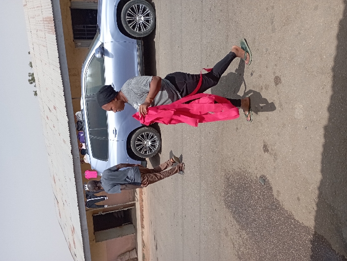 The image displays an outdoor street scene in Unknown, Unknown, during bright daylight with a hazy sky. In the foreground, a dark-skinned woman walks from right to left, slightly turned towards the camera. She wears a grey t-shirt, black pants, and green flip-flops, with her head covered by a black wrap. She carries a significant amount of bright pink fabric in her left arm. Behind her, a dark-skinned man walks in the same general direction, wearing a dark grey t-shirt, brown pants, and light-colored sandals. To the right, a light blue SUV is parked parallel to a single-story building. The SUV features alloy wheels and a roof rack laden with various items, including white, purple, and black bags. The building behind the vehicle has a weathered corrugated metal roof and light brown walls. Laundry, including dark trousers and a pink shirt, hangs on a line or frame in front of the building, to the left of the SUV. An open doorway with visible sacks is present on the far left side of the building's facade. The ground is a paved, grey road surface with a distinct dark, wet-looking patch in the center foreground. Shadows from the people and objects are cast on the road.