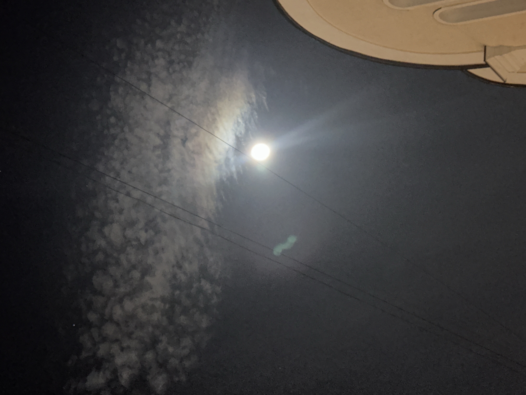 A low-angle shot at night shows the moon partially obscured by clouds. Four power lines run diagonally across the frame from the left side. An object, possibly part of a building, is visible in the top right corner. The location is undetermined.