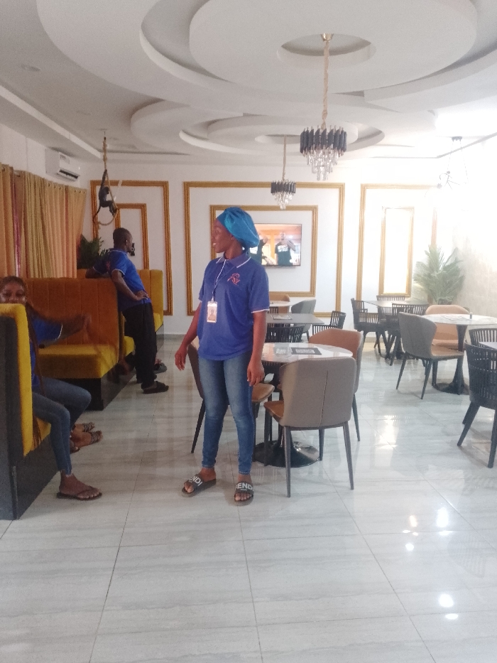 The scene depicts the interior of a commercial establishment, likely a restaurant or cafe, in Lokoja, Nigeria