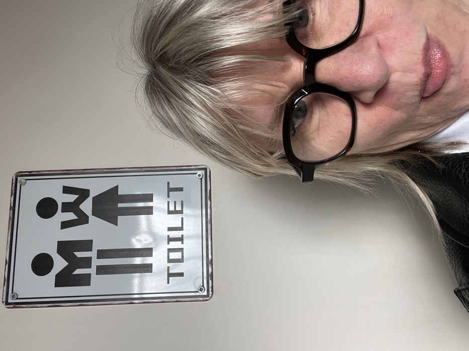 The image displays an indoor scene in Antibes, France, featuring a metal toilet sign affixed to a plain, light-colored wall, alongside a partial view of an adult female. The rectangular sign has a distressed finish with rust-colored edges and is secured by four visible screws. It presents black stylized male and female figures (featuring "M" and "W" shaped torsos, respectively) above the capitalized word "TOILET" on a white background. To the lower right, an adult female with light-colored hair and bangs is depicted, wearing dark tortoise-shell eyeglasses and a dark jacket over a white shirt. Her right eye is visible, and she is shown sticking her tongue out slightly towards the camera.