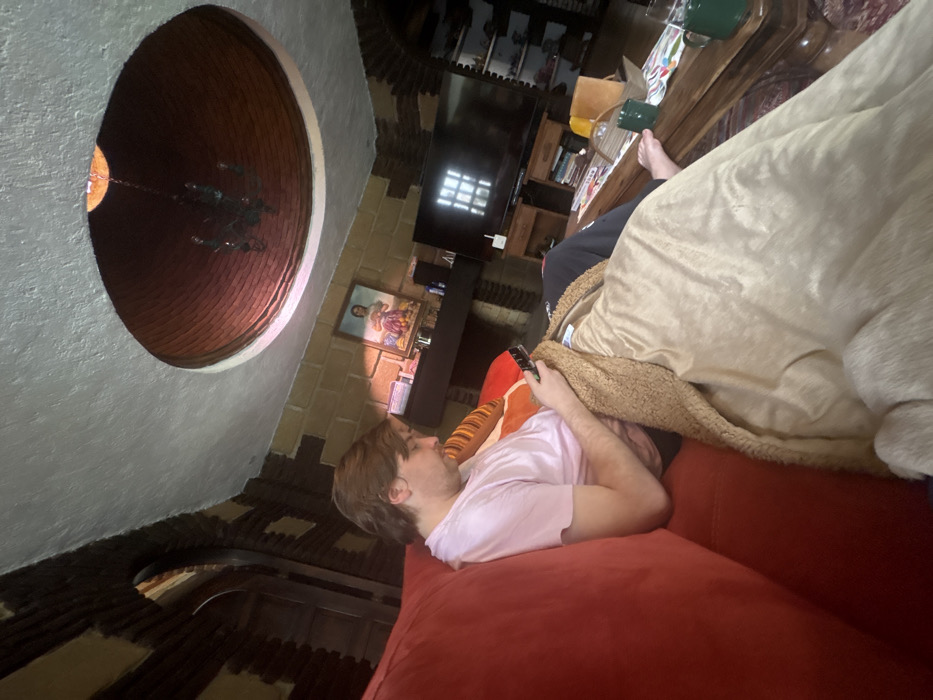 A person lounges on a red couch under a tan blanket, using a remote. The room has a unique design with a round, domed ceiling and a stone brick wall. A television is visible in the background. A picture hangs on the wall near the television. There are shelves in the background.