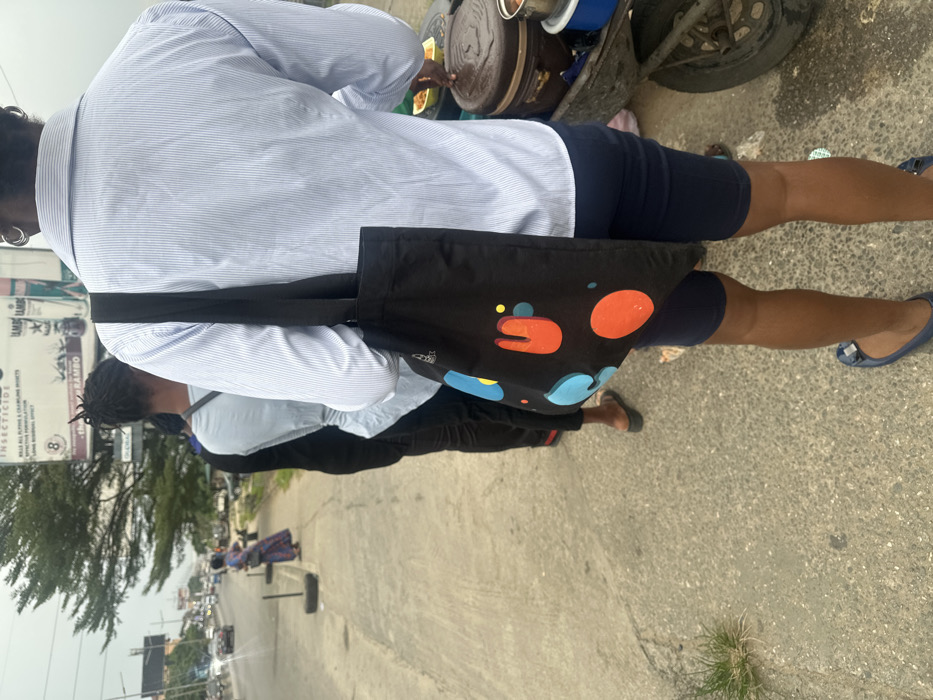 A street scene captures two individuals and a food vendor with a cart. The foreground person wears a striped shirt, navy shorts, and blue flats, carrying a black tote bag with colorful abstract designs. A second person behind is partially visible with a white shirt and dark pants. A food vendor stands at a cart with food preparation underway. The street view includes a sign, trees, and distant traffic, creating a bustling urban atmosphere.