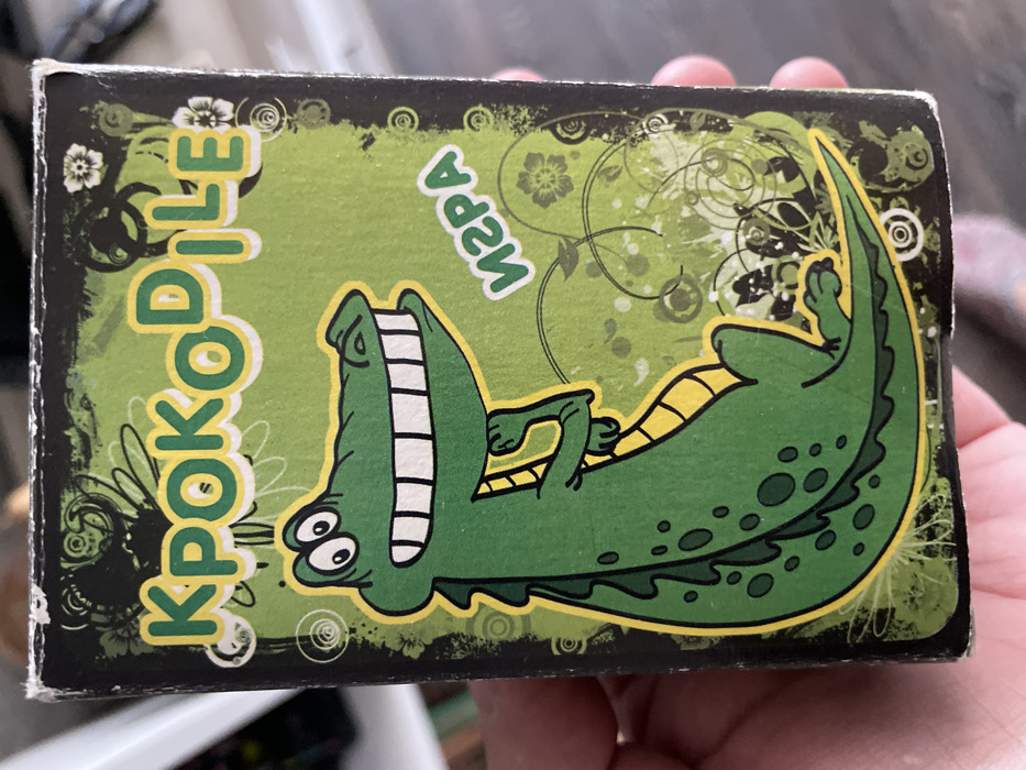 This image displays a rectangular cardboard box, likely for a game, held vertically by a human hand. The box's front panel features a bright lime green background with dark green and black textured borders. The word "KpoKoDiLe" is prominently displayed across the top in stylized green letters with white outlines. Diagonally positioned in the upper-right quadrant is the Russian word "ИГРА" (IGRA), meaning "Game," also in green letters with white outlines. The central illustration is a cartoon green crocodile with a yellow belly, distinctive black spots, and a wide, toothy grin revealing numerous white, rectangular teeth. Its eyes are large and white with black pupils. The crocodile's left arm, from the viewer's perspective, is bent, with its hand resting near its chin. The top edges and corners of the box show minor wear, with some fraying visible. A person's hand, exhibiting light skin tone, grasps the box on the left and bottom edges. The background behind the hand and box is out of focus, indicating an indoor setting. This scene is identified as occurring in Volgograd, Russia.