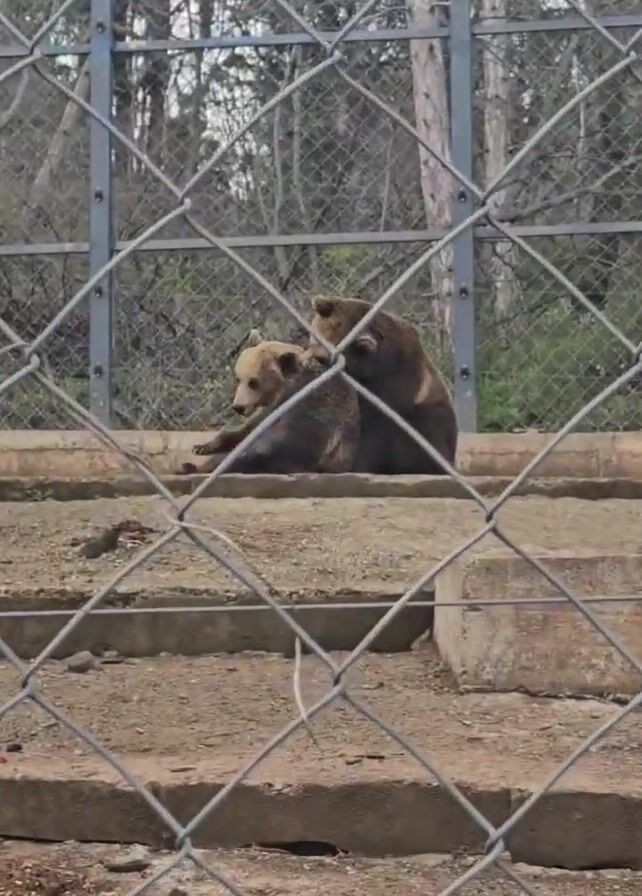 two brown bears in an enclosure. At first, the two bears are sitting close together on a concrete platform within their fenced-in space. One bear appears to be grooming the other by licking it. The camera then pans to the right, revealing a third brown bear pacing behind the fence. The enclosure contains a small, concrete building with a dark opening, and an informational sign is visible on the fence. The environment surrounding the enclosure includes trees and dirt.
